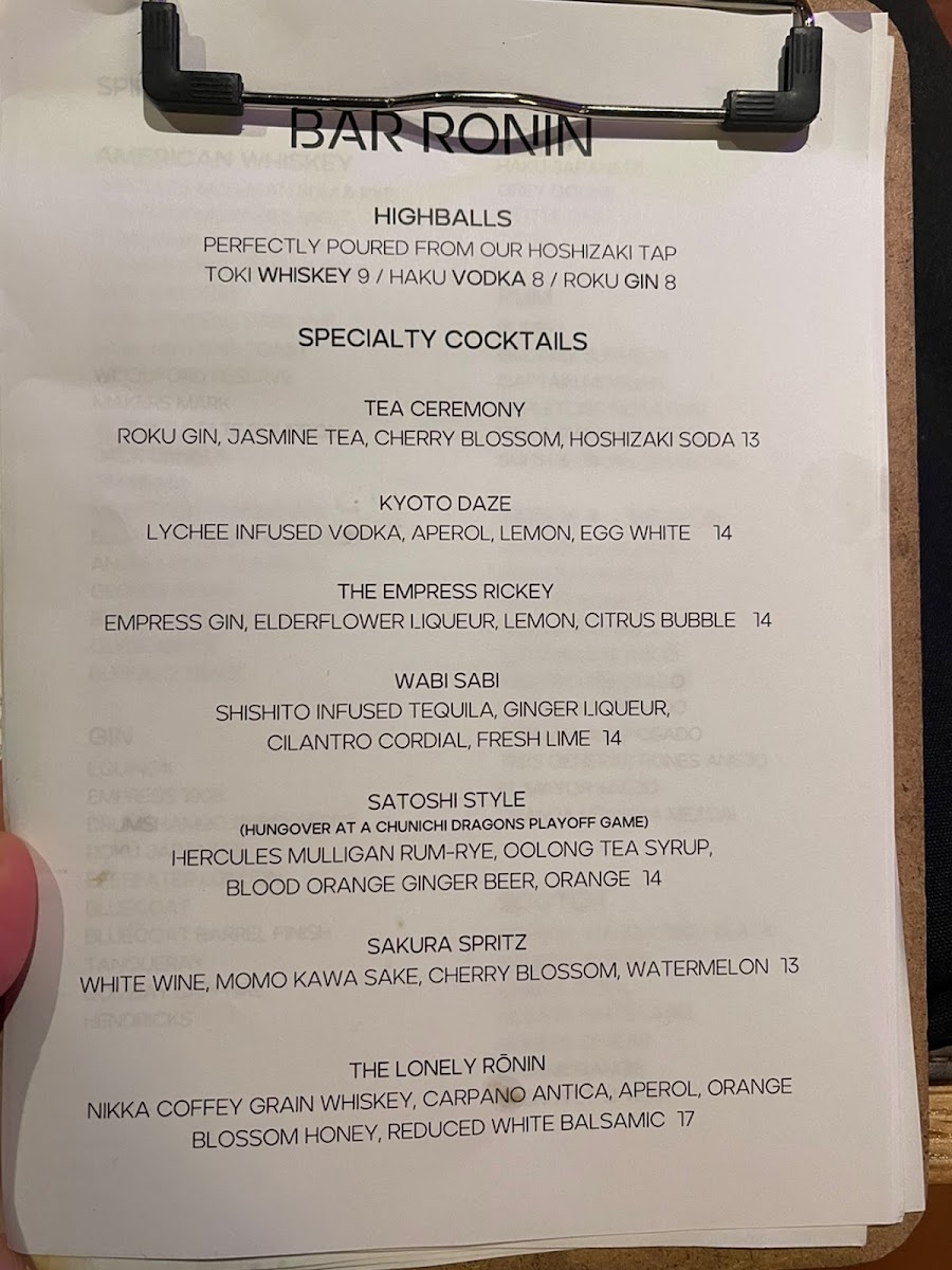 “ Bar Ronin is a must go to spot, and I recommend everyone I know to visit! From the new and inventive dishes and craft cocktails to the ambience and well trained staff this place tops the charts! ”